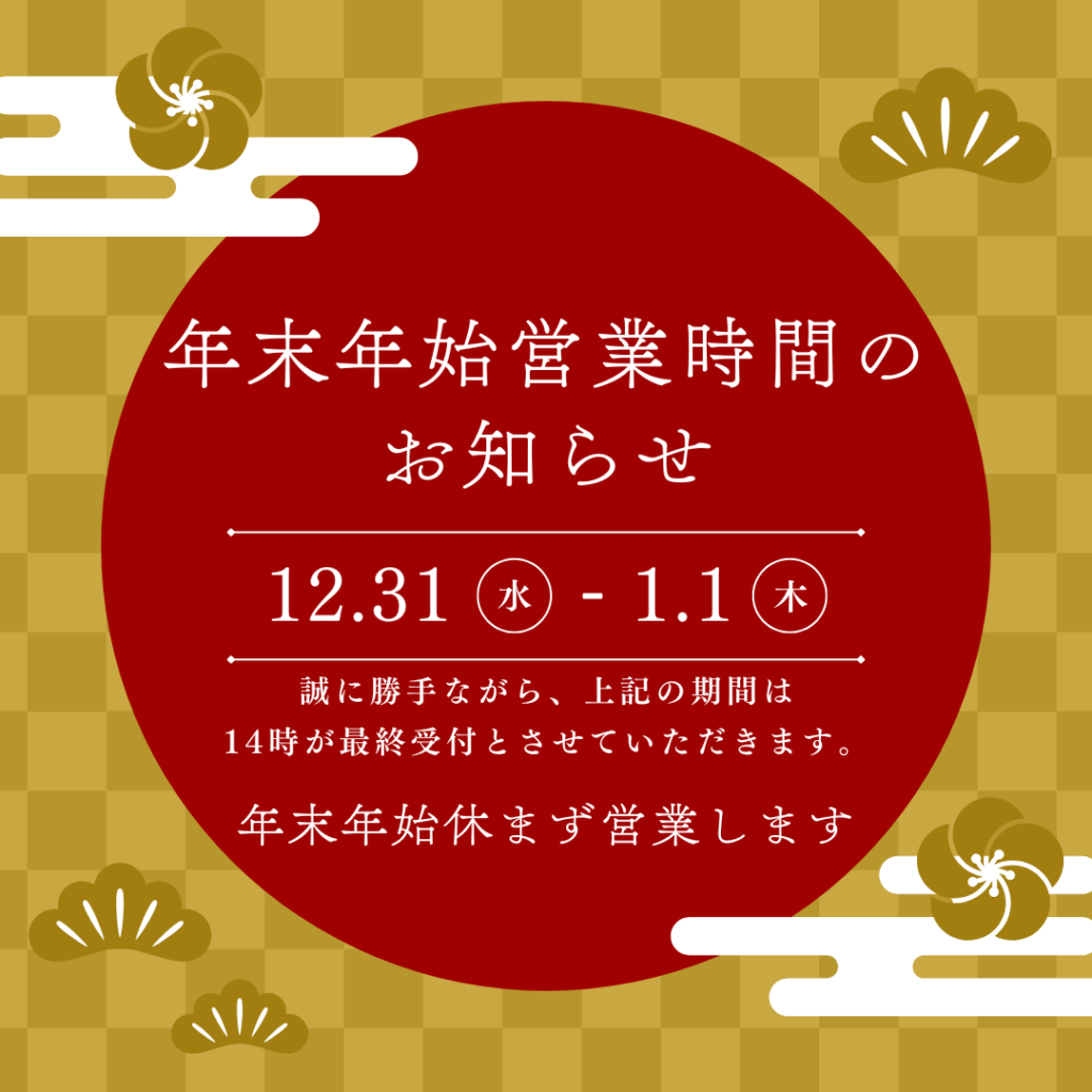年末年始も休まず営業します! 12/31 1/1 は14:00受付終了となりますので、よろしくお願いします。